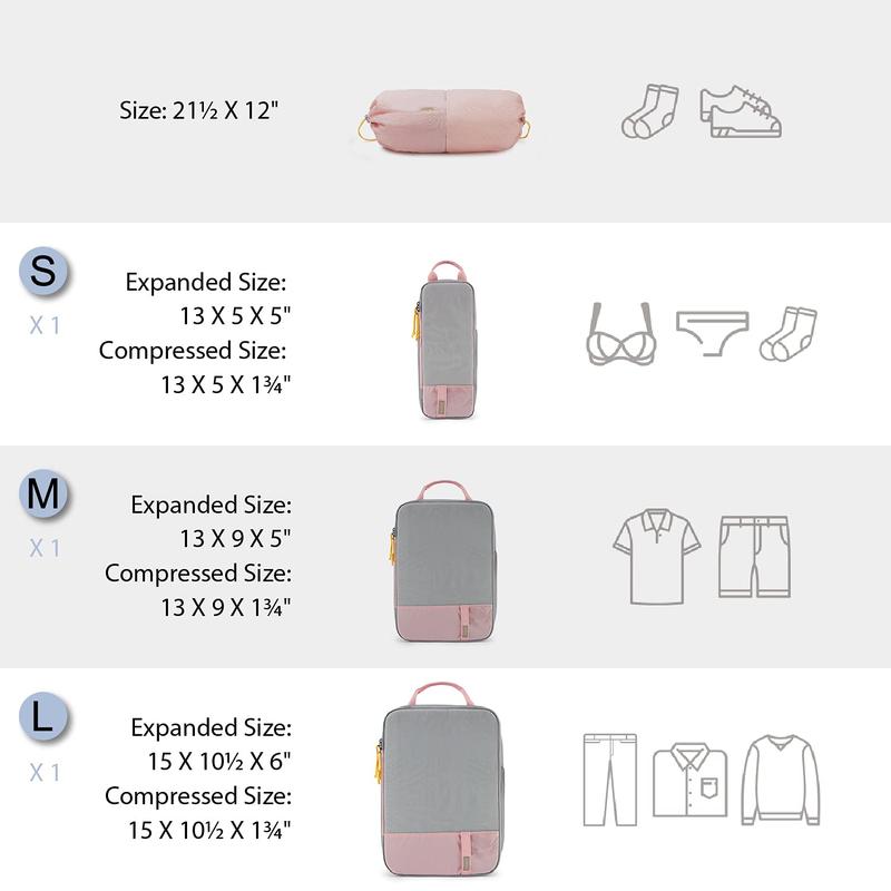 - Easy to Store: With four different-sized compression packing cubes, you can give each item its own designated place. Say goodbye to cluttered suitcases and enjoy the ease of finding exactly what you need. These cubes are perfect for organizing clothes, shoes, electronics, toiletries, and more, providing convenient storage for all your travel essentials.
